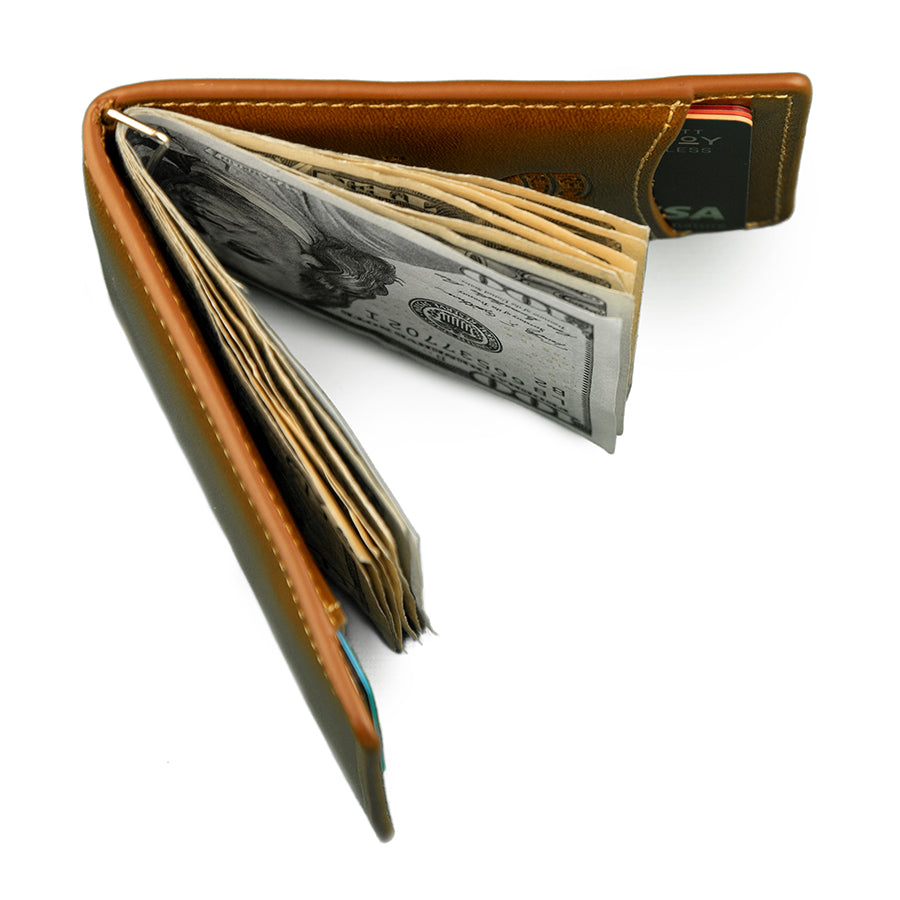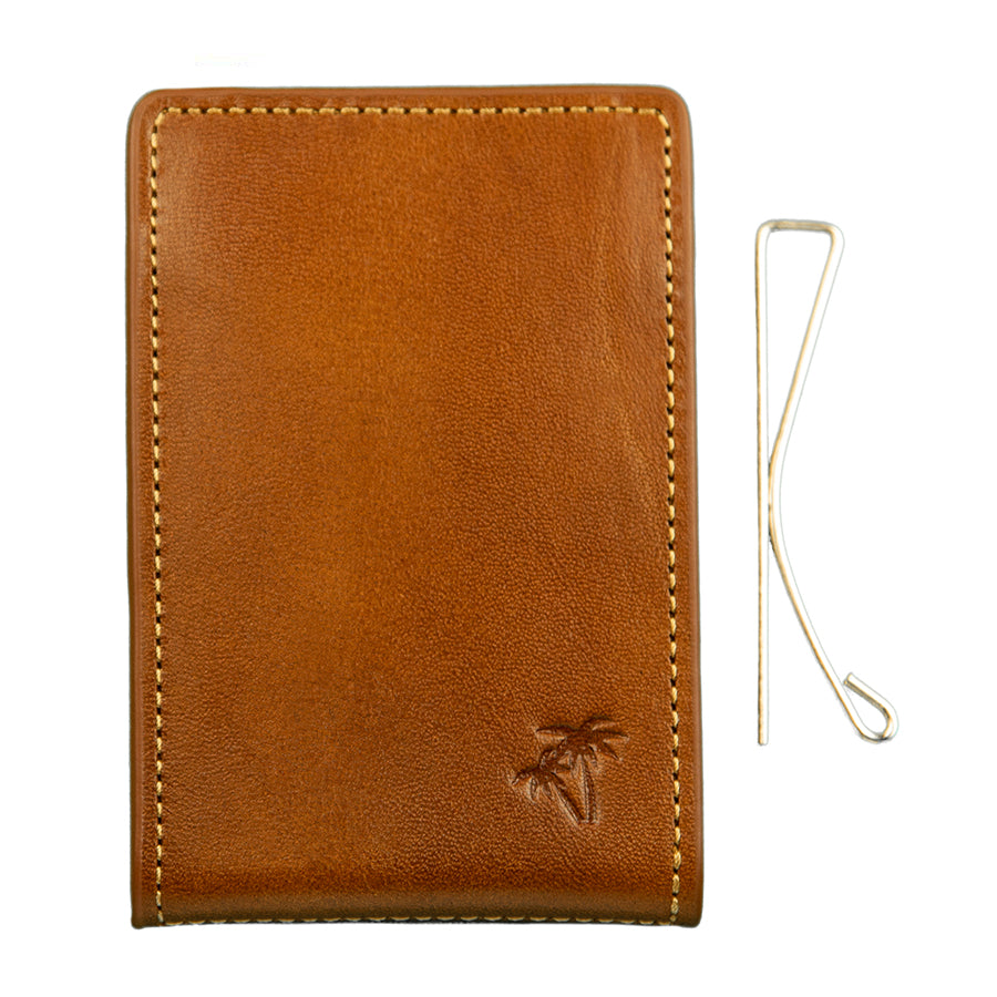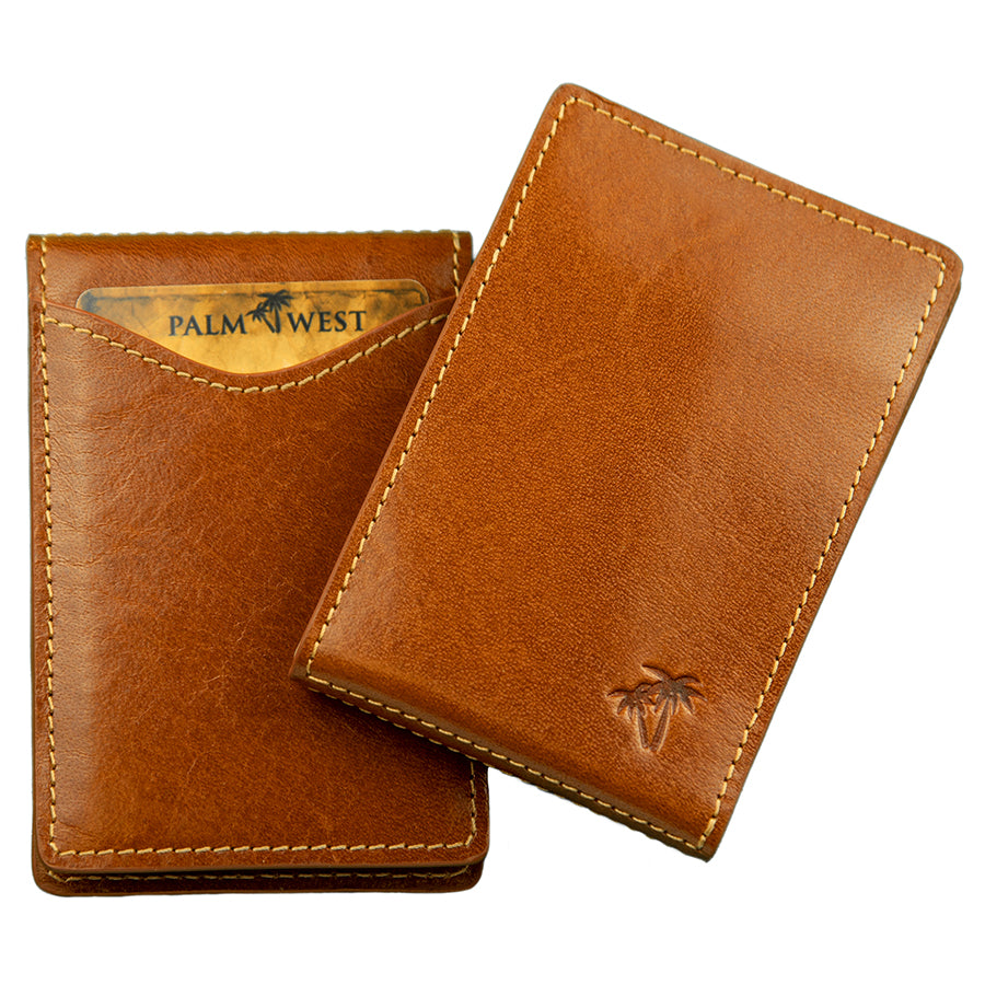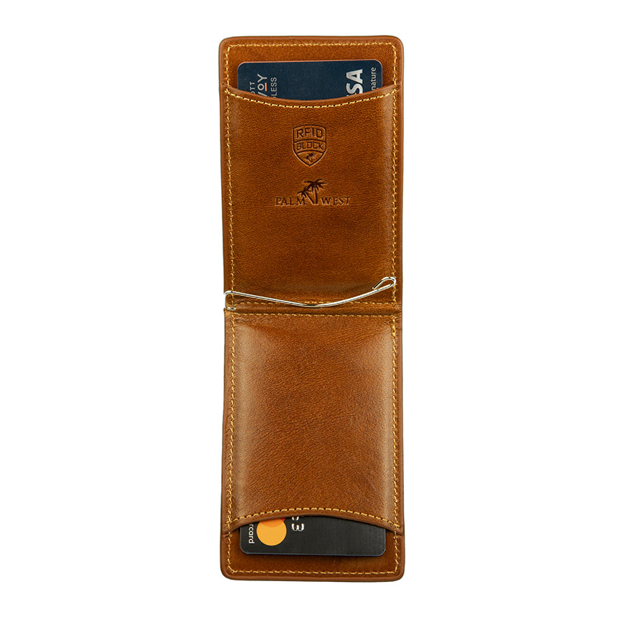Our Brand New front pocket design money clip/wallet is light, thin, has two inside card sleeves to keep your necessary cards, business cards, ID and has a light weight clip to hold several bills. Smooth clean cover with small Palm West brand back side. Also features our patented RFID Blocking liner that protects your personal information embedded in Chip credit cards from High Tech pick pockets.