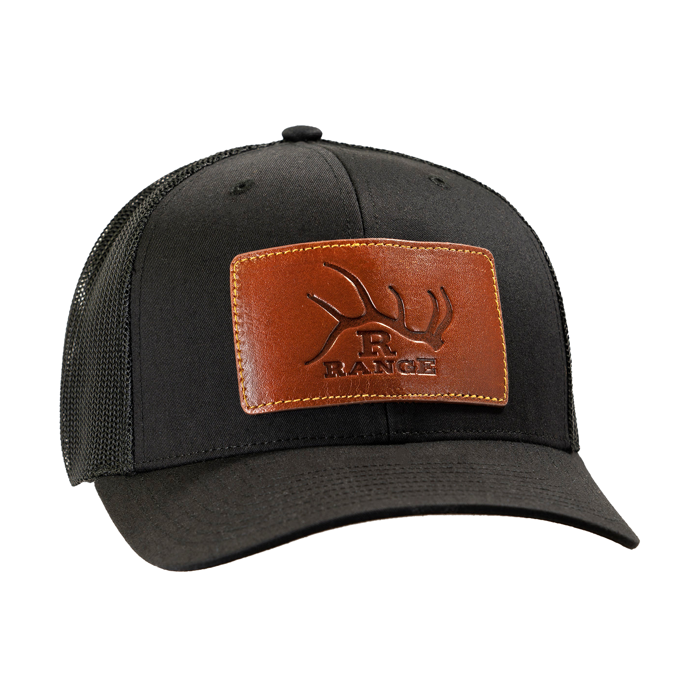 R Range Ball Cap Brand Richardson 112 Trucker Black, Tan Leather Patch Debossed Antler logo