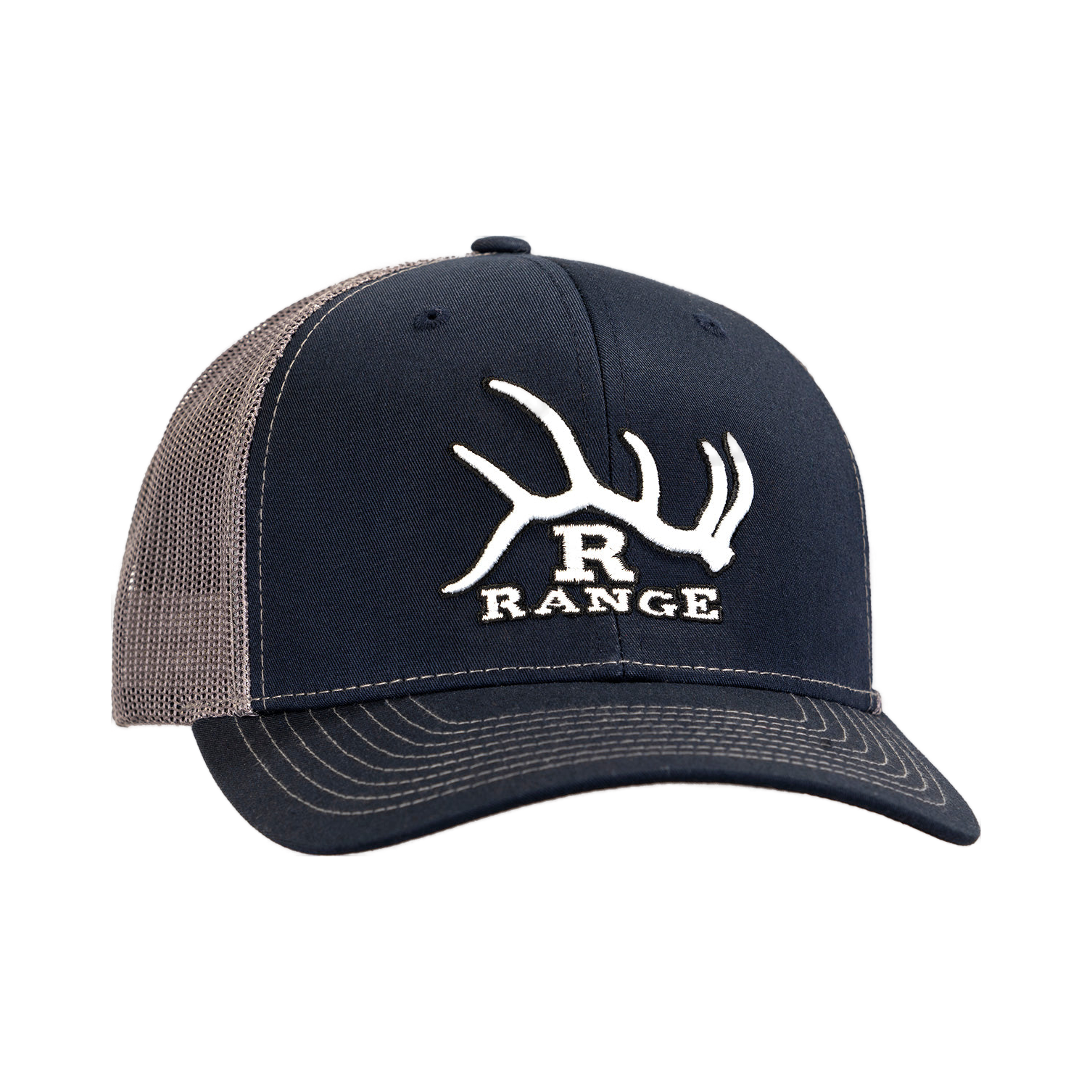 R Range Ball Cap Brand Richardson 112 Trucker Blue/Gray Embroidered Antler Logo