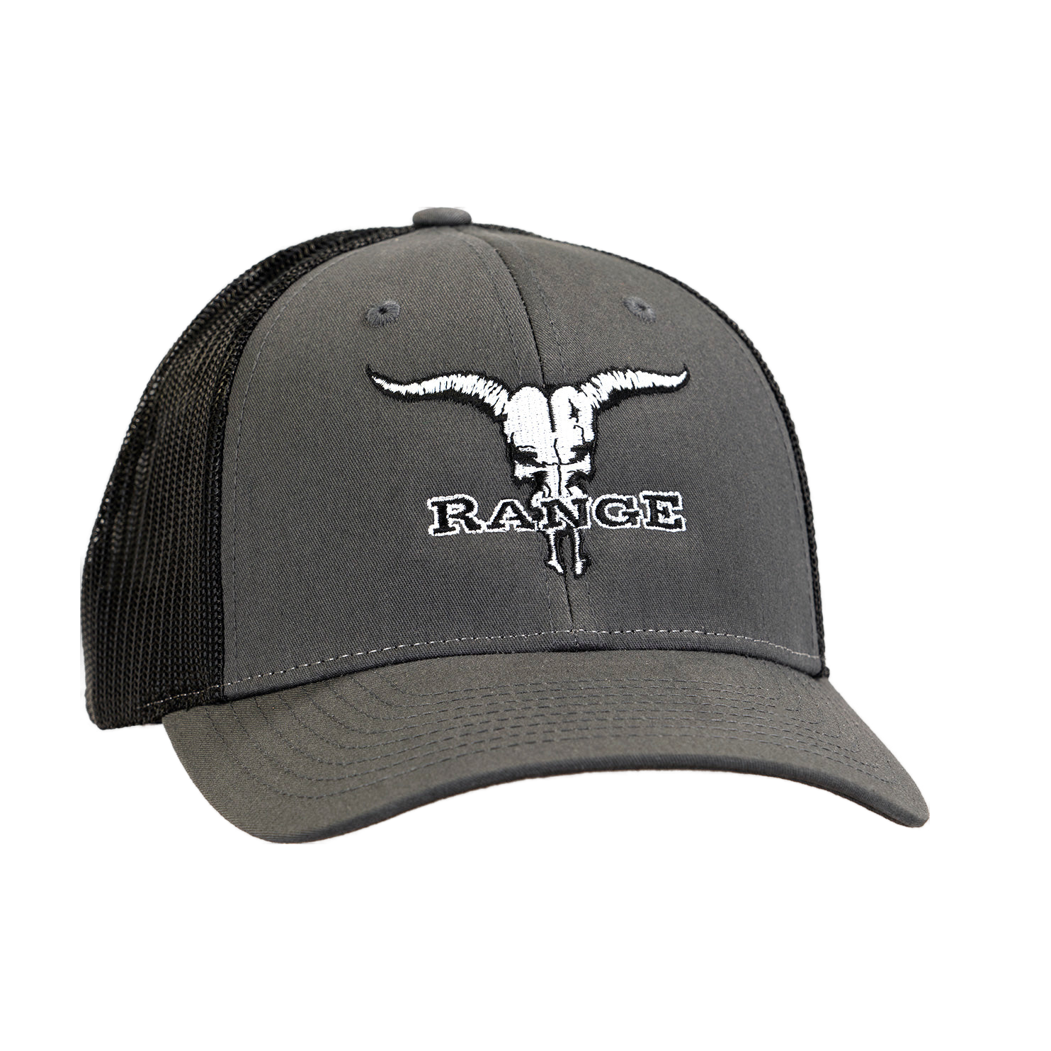 R Range Ball Cap Brand Richardson 115 Low Profile Trucker Gray/Black Skull Embroidered Logo