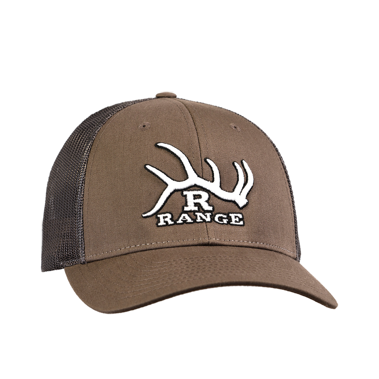 R Range Ball Cap Brand Richardson 115 Low Profile Trucker Chocolate Embroidered Antler Logo